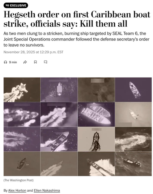 Tento rozkaz, o ktorom informovali médiá, vyvolal škandál v Kongrese a obvinenia až z „vojnového zločinu“. Ide o letecký útok (leteckou flotilou lietadlovej lode) na to, čo Trumpova administratíva nazýva „loďou narkoteroristov“ 2. septembra 2025. Po prvom útoku na loď zostali nažive preživší, ktorí sa vznášali s troskami na mori. Bol vykonaný druhý útok, aby ich dorazili. Údajne minister obrany vojny Pete Hegseth nariadil admirálovi Frankovi Bradleyovi, veliteľovi eskadry: „Zabite ich všetkých“.
