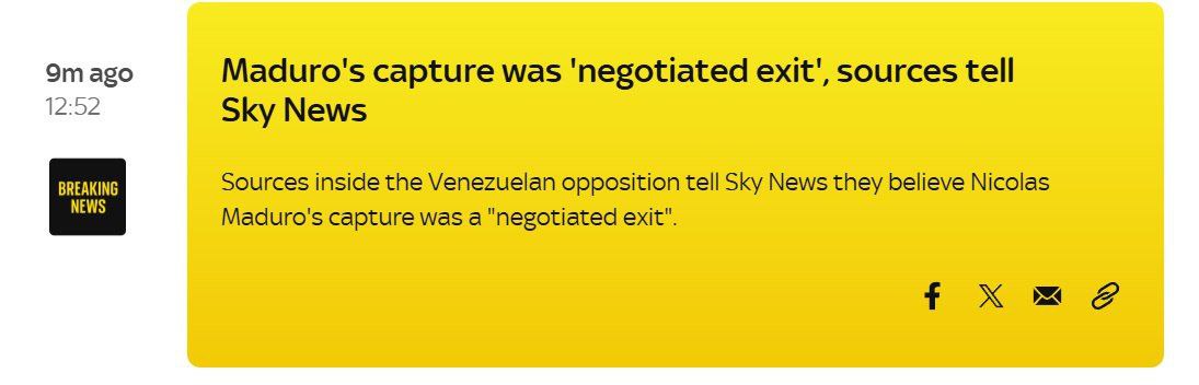 O tom informuje SkyNews s odvolaním sa na zdroje v opozícii Venezuely. New York Times už skôr uviedol, že počas vojenskej operácie nedošlo k stratám v armáde USA, čo môže potvrdiť, že prezident bol zradený. Zdá sa, že zatknutie prezidenta Venezuely bolo dosiahnuté počas rokovaní s elitou krajiny.