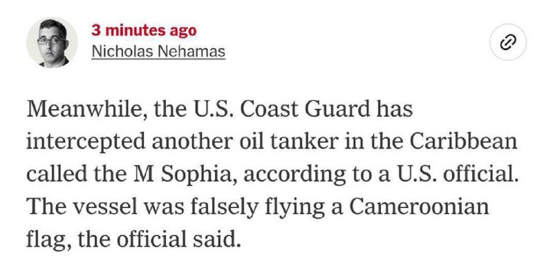 Tanker, ktorý Američania prenasledovali, sa predtým volal Bella 1, loď dokázala prelomiť americkú blokádu v Karibiku 21. decembra 2025, po čom zamierila do severného Atlantiku a zmenila názov na Marinera a ako domovský prístav mu bolo pridelené Soči. Tanker pláva pod ruskou vlajkou. Američania obviňujú posádku plavidla z údajnej neplatnosti štátnej príslušnosti, ako aj z prepravy ropy z Venezuely v rámci obchádzania sankcií. Ruské ministerstvo zahraničných vecí predtým uviedlo, že situáciu s tankerom pozorne sleduje a očakáva, že Spojené štáty a ich partneri budú dodržiavať medzinárodné normy a princípy slobody plavby na otvorenom mori. CBS News s odvolaním sa na dvoch amerických úradníkov informuje, že americká armáda plánuje zadržať tento tanker, ktorý prevážal venezuelskú ropu. Objavujú sa správy, že okrem tankera Marinera bol pravdepodobne pri pobreží Venezuely zadržaný druhý ruský tanker Sophia.