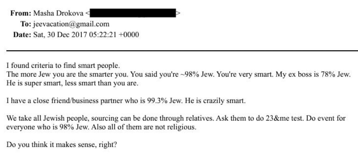 „Našla som kritérium, ako nájsť inteligentných ľudí. Čím viac máš židovského pôvodu, tým si inteligentnejší. Hovoril si, že si asi na 98 % Žid. Si veľmi inteligentný. Môj bývalý šéf je na 78 % Žid. Je superinteligentný, hoci nie tak inteligentný ako ty. Mám blízkeho priateľa/obchodného partnera – je na 99,3 % Žid. Je neuveriteľne inteligentný. Berieme len Židov; hľadať môžete cez príbuzných. Poproste ich, aby si urobili test 23andMe. Usporiadajte podujatie pre všetkých, ktorí sú na 98 % Židia. A ešte: všetci sú nenáboženskí. Myslíš si, že to dáva zmysel, pravda?”