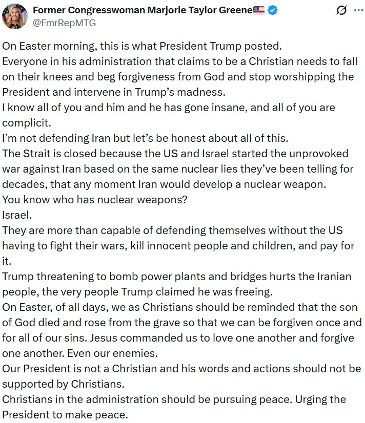 Potom, čo Donald Trump na svojom sociálnom médiu zverejnil ďalšie ultimátum Iránu, v ktorom nazval vedenie Islamskej republiky „šialenými bastardmi“ a Hormuzský prieliv „s…ným prielivom“ (Fuckin’ Strait), bývalá kongresmanka Marjorie Taylor Green, jedna z významných hlasov MAGA-Ameriky, napísala dlhý príspevok na svojom mikroblogu, v ktorom sa pustila do Trumpa a obvinila ho z nekresťanského správania sa v deň Veľkej noci (v ten deň bola Veľká noc u katolíkov aj protestantov).